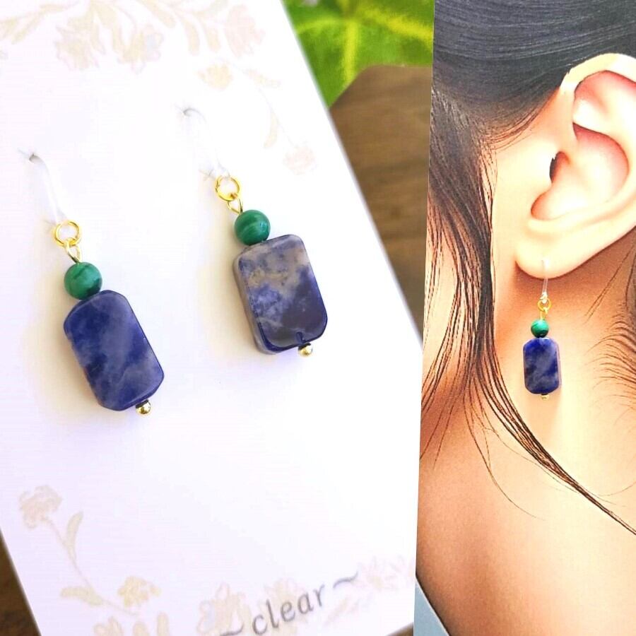 ソーダライト ラフタンブル+マラカイト ピアス パワーストーン ハンドメイド 天然石 邪気払い 情緒の安定 癒し